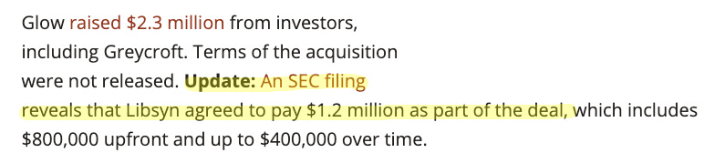 I stumbled on this article about Libsyn’s acquisition of the podcast monetization startup Glow: